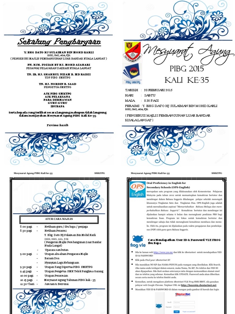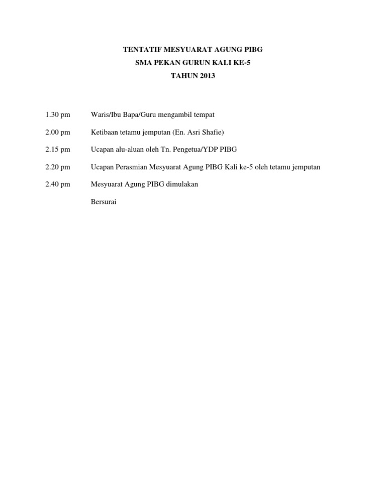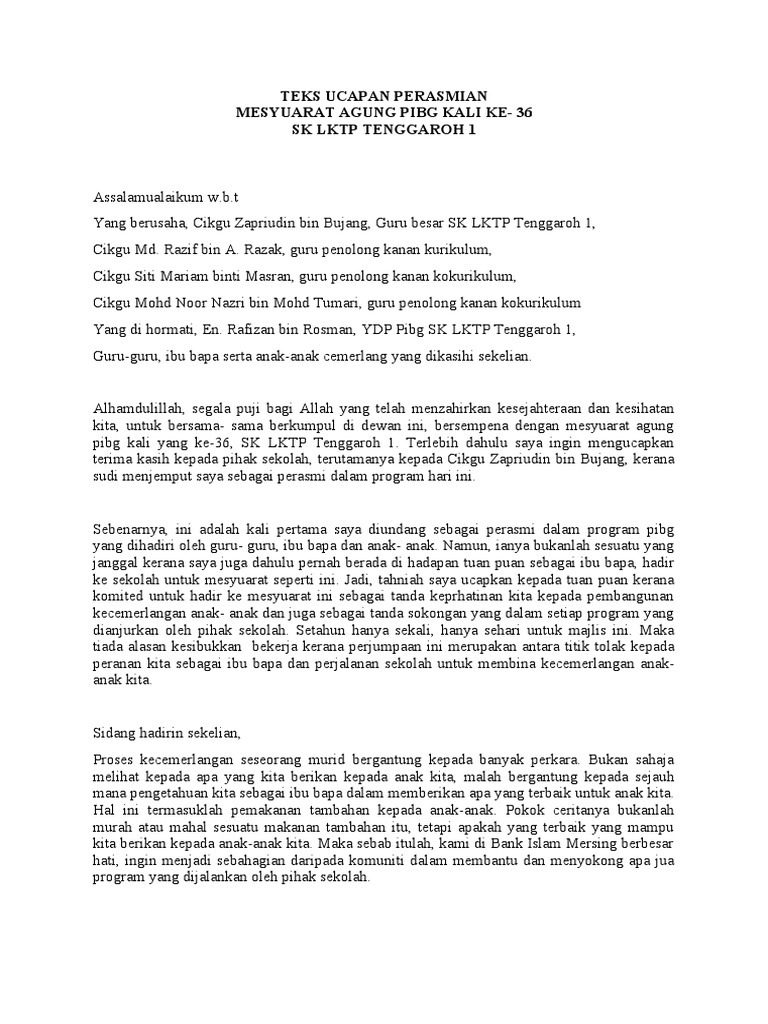 Teks Pengacara Majlis Perasmian Mesyuarat Agong Pibg from imgv2-1-f.scribdassets.com Majlis makan malam amal pibg sejati 2019. Ucapan mb johor @khalednordin sempena majlis perasmian mesyuarat agung pibg sk taman scientex. Persatuan ibu bapa dan guru (pibg)smk permatang tok jaya(model khas pulau pinang)sekolah kluster kecemerlangan fasa iii13800 sungai dua, butterworth tel : Mesyuarat pibg kali ke 2. 4.45 pm pendaftaran peserta ketibaan naib canselor unimas ucapan aluan pendaftar unimas ucapan perasmian. @inproceedings{ahmad2016teksun, title={teks ucapan nc aluan perasmian pembukaan sukum 2016}, author={m. Teks majlis kuarter master teks ucapan majlis kuarter master. Pengumuman sukacita saya ingin memaklumkan tentang perjalanan program perasmian mesyuarat agung majlis guru cemerlang ne teks personalized items person.