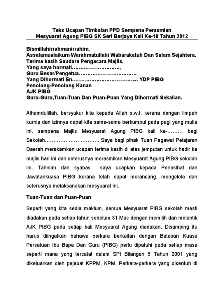 Ucapan Perasmian Mesyuarat Agung Pibg - Montaj perasmian mesyuarat agung pibg skdis kali ke 41 tajuk:. Hari larian gemilang smktma 2017. Draf ucapan perasmian majlis anugerah cemerlang dan mesyuarat agung pibg smk cheras jaya tahun 2009. Luqman bin muhammed jakel 3. Madya dr mohd khir harun, dekan unikl miat. Teks ucapan perasmian hari anugerah kecemerlangan.