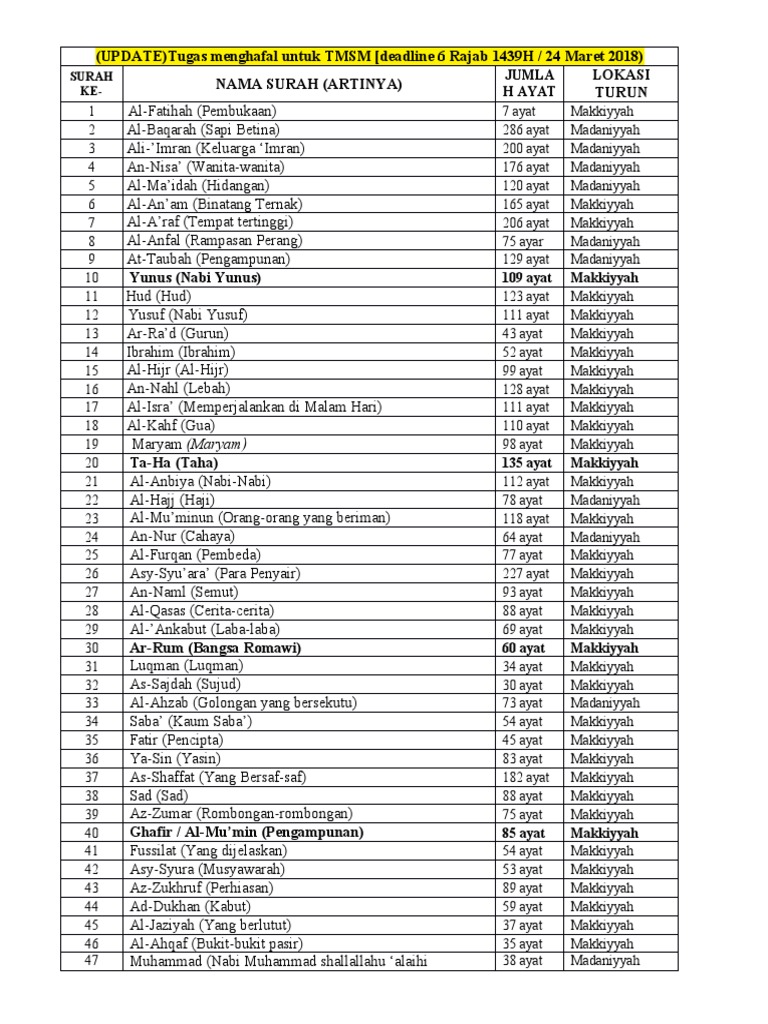 Sebab dalam surat ini terkandung pokok isi al quran. Nama adalah sebuah jati diri ataupun identitas diri dari seseorang. Dan dicetak di berbagai belahan dunia islam. Halaqah pagi menghafal nama nama surah dalam alquran dan artinya maskanul huffadz bintaro. Berikut adalah nama surat beserta arti dan jumlah ayat serta tempat turunya ayat tersebut.